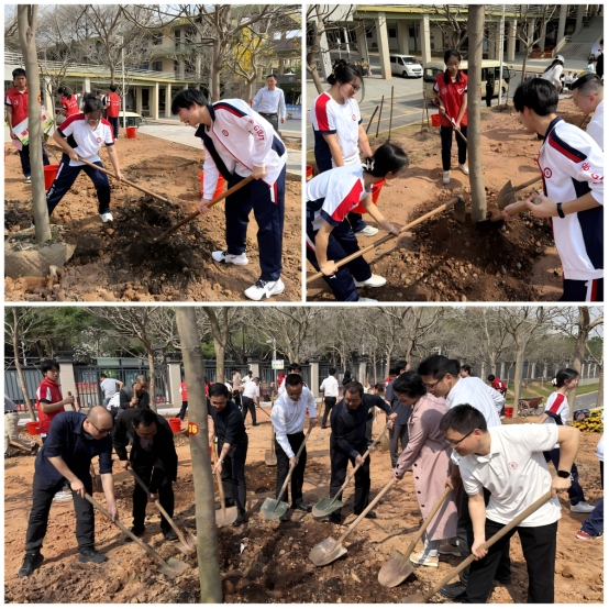 教师一同出席活动,与在校学生一起亲手植下新苗,为校园增添一抹新绿。