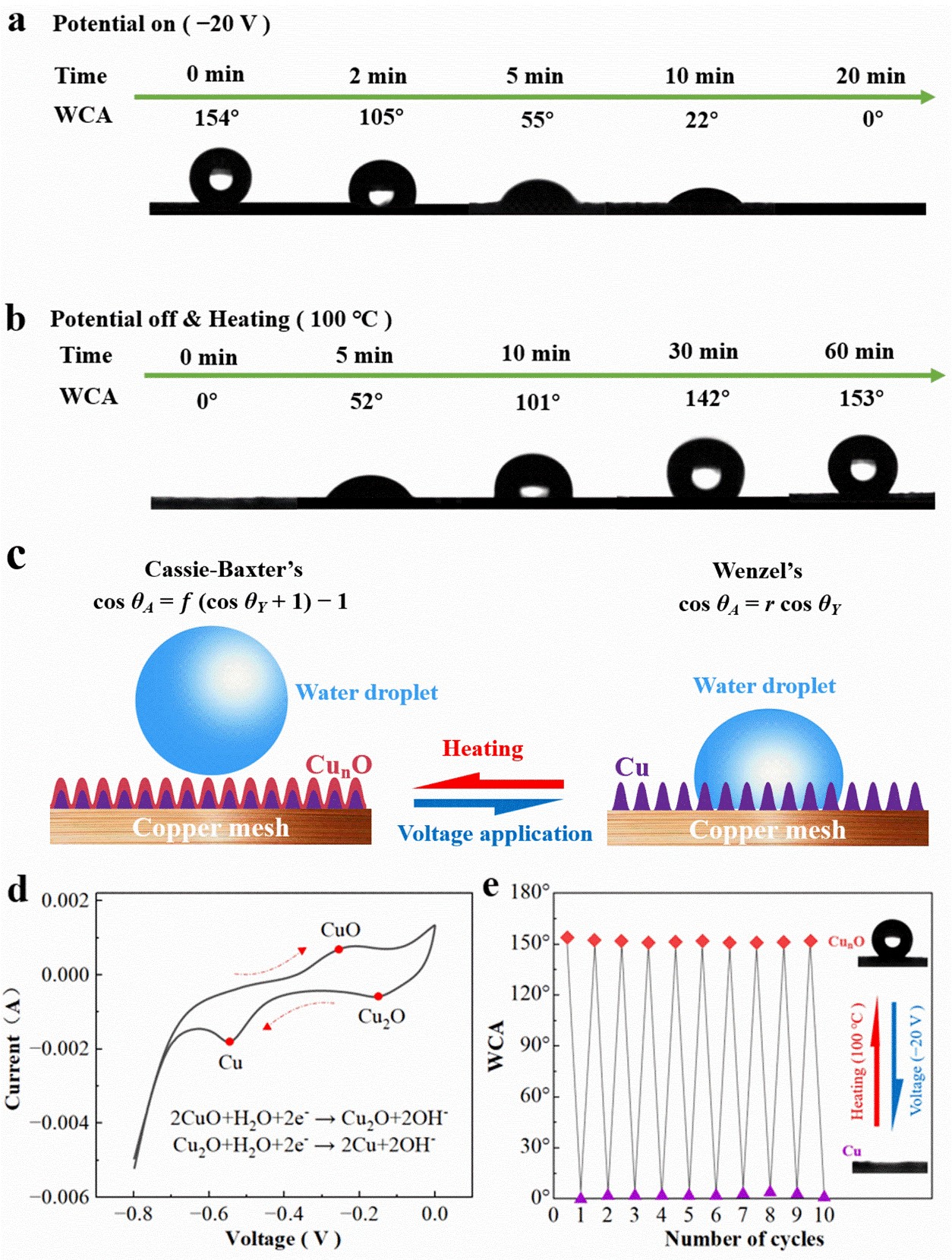 图 3.铜网膜表面可逆的超润湿转换。(a)施加–20 V电压和(b) 100℃加热情况下水滴在CMe表面上的接触角演变。(c)超浸润可逆转换过程示意图。(d)铜网膜的循环伏安(CV)曲线。(e) 可逆转换的10个循环的水接触角变化。