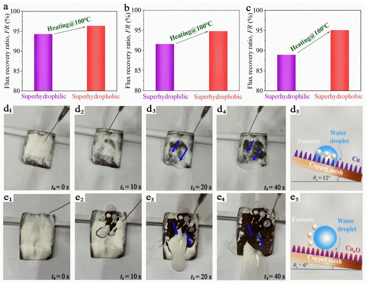 膜具有优异的抗污性能并不代表具有良好的清洁效果。尽管超亲水铜网膜表现出较好的防污能力(图4 a–c),但其在相同污染情况下的清洗效率却低于超疏水膜(图5 a–c)。超亲水膜依赖强大的水合排斥力来抵抗污染物靠近,这与细胞膜防污相似。相比之下,超疏水膜通过其低表面能实现自清洁,这类似于荷叶效应,能够有效地去除膜上粘附的污垢。图5d和e进一步揭示了超浸润膜的自清洁行为。胶体铝粉均匀地涂覆在超亲水和超疏水铜网膜表面,通过注射器从样品的上端缓慢注入水,以观察液体在铜网表面上的清洗行为。如图5d1–d4所示,经过40秒的清洁,超亲水膜仅去除部分污染物,膜上残留着液体和固体的混合物。这是由于在超亲水状态下,水滴被卡在粗糙纹理中,阻碍了它们的移动,从而抑制了有效的清洗(图5d5)。相反,对于超疏水样品(图5e1–e4),水滴能够有效地带走了胶体污染物。这是因为在超疏水表面上,水滴悬浮在粗糙纹理之上,使得水滴能够轻松地在倾斜的表面上滚动(图5e5),进而有效地收集并去除表面杂质,实现了自清洁效果。