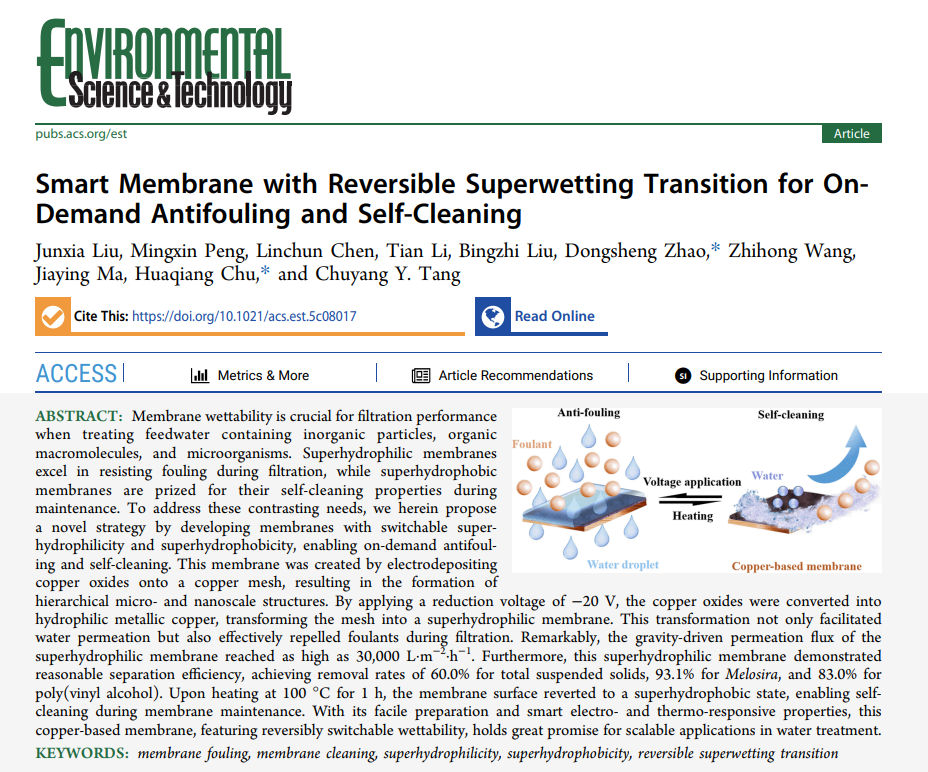 市政工程专业彭铭鑫、陈霖纯(指导老师柳君侠)在环境领域顶刊(Environmental Science & Technology)以“Smart Membrane with Reversible Superwetting Transition for On-Demand Antifouling and Self-Cleaning”为题发表最新研究成果。论文基于智能仿生理念,提出构建“超亲水/超疏水”智能转换来按需实现膜“抗污染/自清洁”,研究成果为膜法水处理中膜污染的高效控制提供新思路。