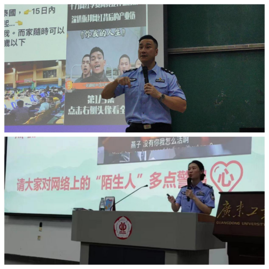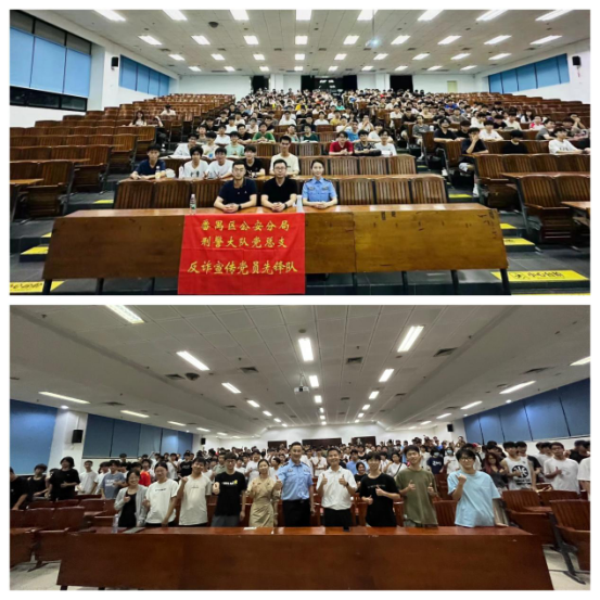 邀请番禺区公安分局刑警大队王鑫警官、庞彦警官分别在1号大教室、5号大教室为同学们进行防诈反诈宣传教育,保卫处詹俊宏老师、吕启华老师,年级辅导员刘思利老师、曾阅老师以及2022级580余名学生参加本次会议。