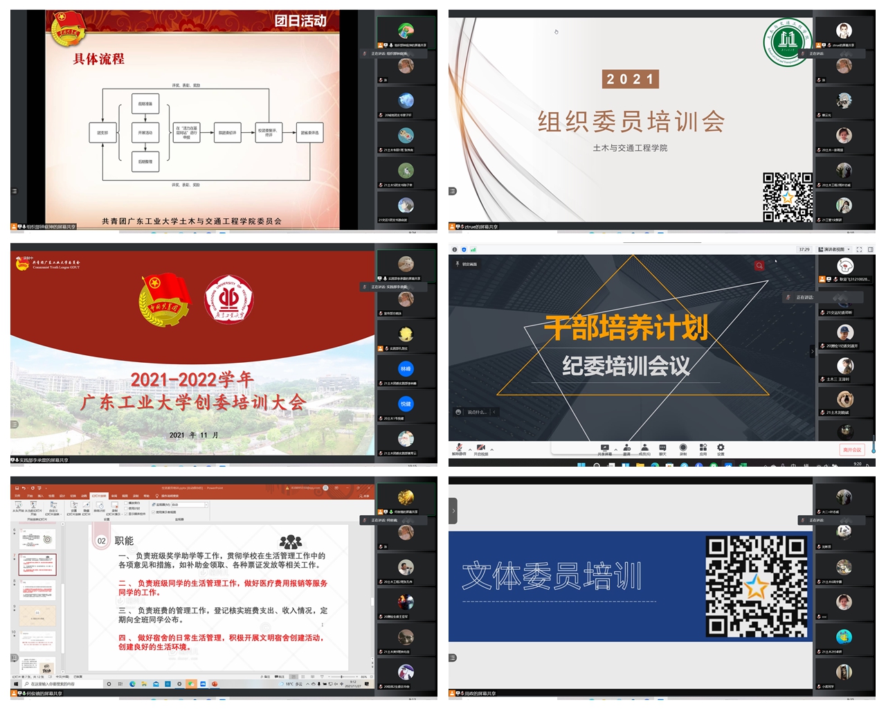 11月27日,培训班面向全体班干部线上开展了团支部建设、班级建设业务培训会。针对班干部的职责划分,本次培训分九场进行。培训会由团委、学生会等学生组织相关部门负责人主讲,主讲人从班级工作现状以及当前面临的工作问题与班干部进行了分析,然后从班干部的定位、作用、意识、素质、主要任务以及收获等方面,结合实际情况,进行了详细的讲解。通过培训,班干部们对如何开展班级工作、团支部建设有了更加具体的认识,并启示他们以优秀班集体为榜样,认真开展班级建设各项工作,更好地为班里同学服务。