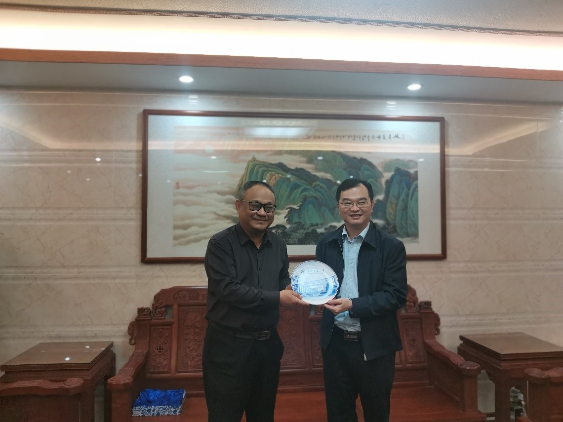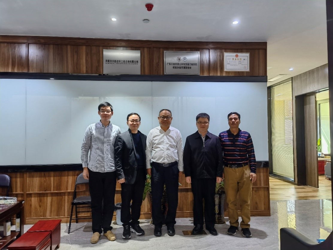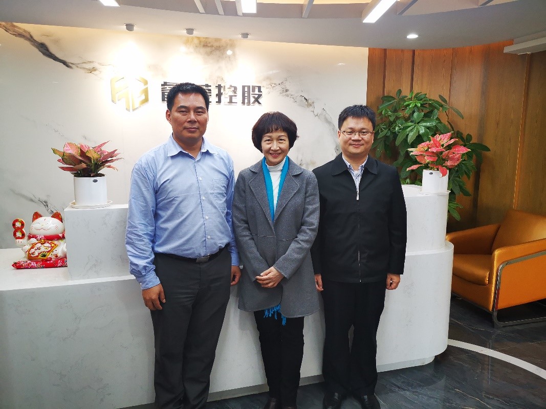 党委书记邓俊,院长刘锋,党委副书记陈颂坚一起拜访工民建专业89届校友——方直集团董事长陈专,就nowscore捷报
