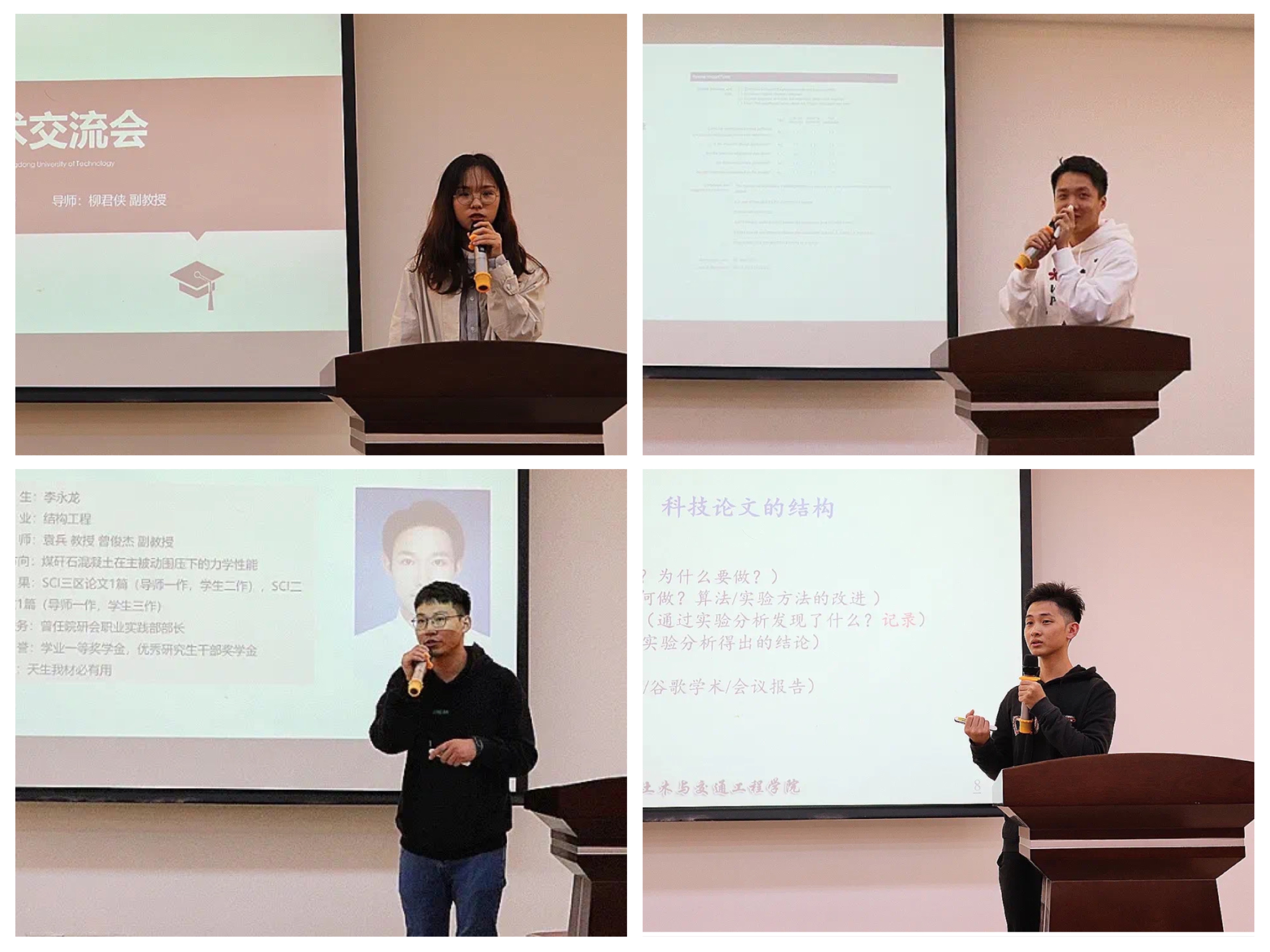 交流会上,受邀代表依次上台,从学业规划、科研创新、社会实践、论文写作与投稿等方面分享自己的宝贵经验。范雅倩师姐通过分享自己的科研和学生干部经历,向大家展示科研生活也可以多姿多彩,科研并不意味着孤独和枯燥,要加强与导师和同学的沟通交流,同时通过坚持体育锻炼,调节自身情绪和科研压力;吴志华师兄向大家细致介绍了课题组的研究方向以及科研中发生的趣事,并以自身论文写作和投稿经历总结出相关注意事项和技巧干货;李永龙师兄告诫同学们一定要做好学业规划,注重培养自己的创新实践能力,以积极乐观心态去迎接研究生阶段的各项挑战,并结合自己近期的求职经历,提醒大家要练就过硬本领,为将来的求职就业打好基础;陈鑑华师兄向同学们介绍了自己研究生阶段参与的多项科研项目以及在此过程中收获的成长,建议同学们多参加学术会议,进一步认知行业前沿动态。