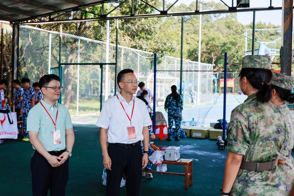 党委书记周建强带队,党委副书记陈颂坚、辅导员刘甜甜、唐熙一同前往大学城校区田径场,亲切看望并慰问正在参加军训的2025级本科新生。