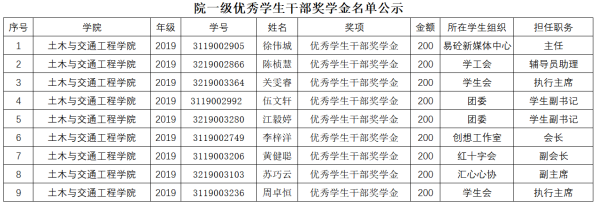 总计:优秀学生一等奖学金20名,优秀学生二等奖学金69名,优秀学生三等奖学金103名,优秀学生干部奖学金15名,学习标兵奖学金15人,学业进步奖学金56名。