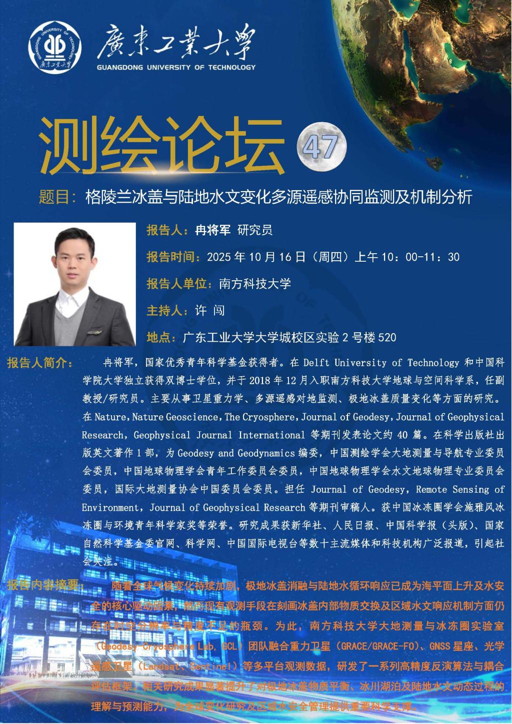测绘论坛第47期 格陵兰冰盖与陆地水文变化多源遥感协同监测及机制分析