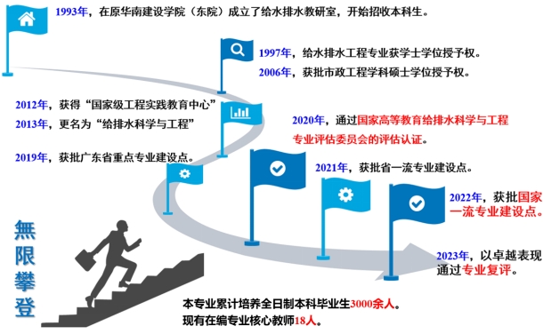广东工业大学于1993年创办“给水排水工程”专业,是国内较早创办给排水专业的院校之一。经过30多年的建设,本专业于2005年已有市政工程硕士点,2012年获得了“国家级工程实践教育中心”与“广东省大学生实践教学基地”。本专业是广东省重点专业,承担着为广东省培养水务领域高素质人才的重任。2020年底,本专业通过住建部高等教育给排水科学与工程专业评估委员会的评估(认证)(广东省仅两家),标志着我校给排水科学与工程专业的建设迈上一个新台阶。2021年,本专业获批广东省一流专业建设点。2022年,本专业获批国家一流专业建设点。2023年,本专业以卓越表现通过住建部高等教育给排水科学与工程专业评估委员会的评估(认证)复评。2023年软科中国大学专业排名位列A层次。本专业在生源质量、师资结构、学科建设、培养体系、立德树人、教研成果和行业贡献等方面都具有独特优势,在国内同类学校中名列前茅。目前在校生300余人,90%的学生来自广东省。